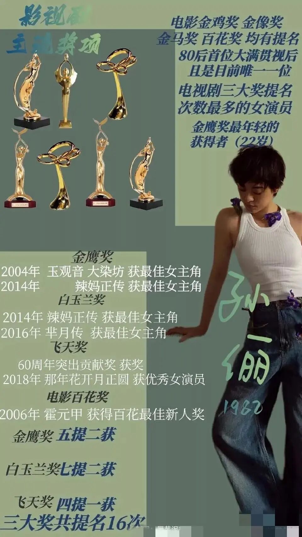 但是,说到底,尽管赵丽颖没有像孙俪那样拿到过许多奖项,但孙俪的奖项并不让人眼前一亮,而赵丽颖虽败犹荣,因为她输给的都是优秀的竞争对手。