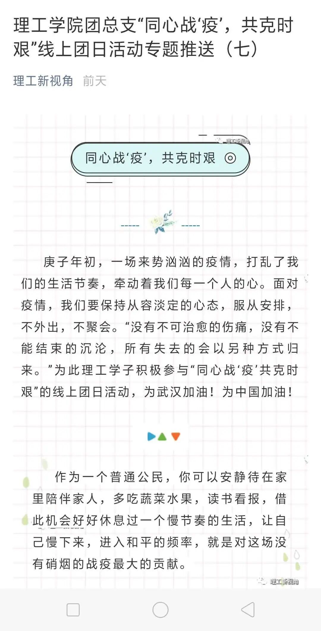 理工学院团总支组织各班团支部开展学习抗疫英雄人物事迹,健康生活打卡,原创公益标语、抗击疫情海报等网络文化作品创作,制作专题推送,展示了理工学子参与线上团日活动的积极性,营造浓厚的抗疫氛围。