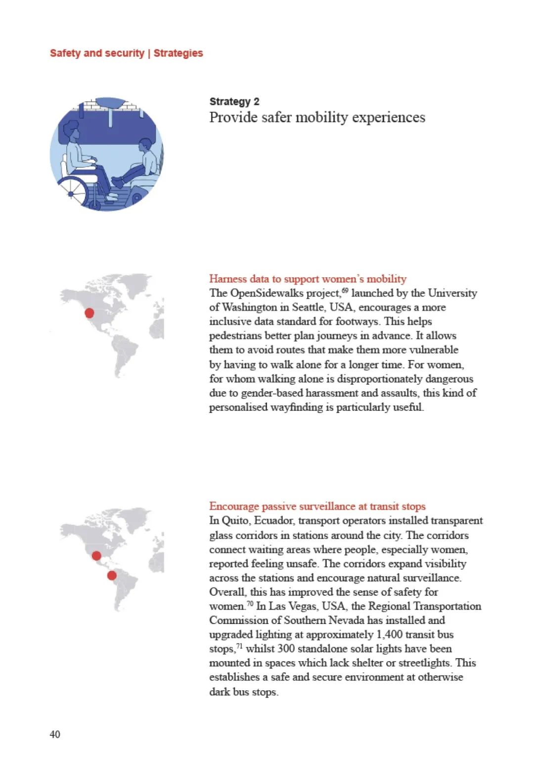 纵观几乎世界上的任何一个城市都面临着显而易见的挑战:走夜路时,不足的照明给女性带来的惴惴不安;没有覆盖到整个社区需求欠缺设计的公共空间;还有公共交通系统上的攻击或骚扰所带来的威胁,都是女性选择使用公共交通的阻碍,它的重点似乎更多地是为通勤者服务,而不是给予女性什么样的帮助。