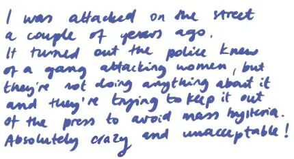 几年前我在街道上被袭击。结果这些警察明明知道这是专门袭击女性的犯罪团体所为,却并不打算采取行动,甚至避免让媒体报道,推脱是怕引起人们陷入恐慌。这简直是疯了,令人完全无法接受!