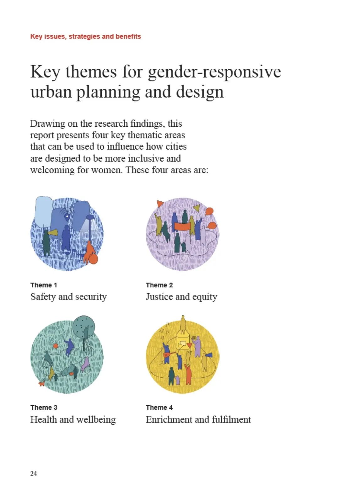 该报告借鉴了既有文献资料和对世界各地的不同女性和男性群体进行的原创性研究,为关于城市女性状况的既有争论贡献了新的论据。报告提出了四个关键主题领域,可用于影响城市规划和设计的方式,并使城市对女性更加开放包容。四个关键领域是: