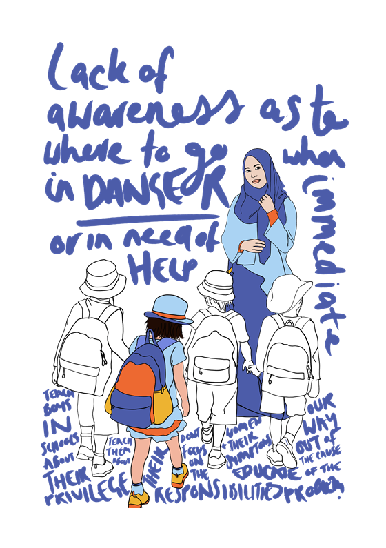 当遇到紧急危险或需要帮助时,缺乏去哪里寻求帮助的意识。让学校里的男孩了解他们的特权。教会他们自己的责任。不要把注意力集中在女性的反映症状上。我们的教育应当发现问题的起因是什么。
