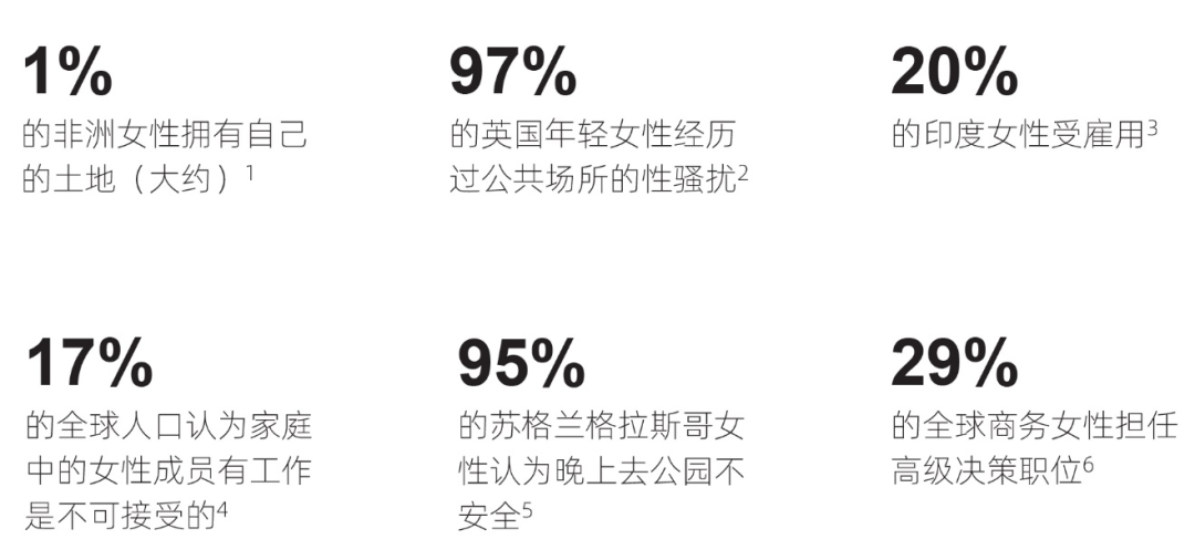 这一现实在全球范围内存在,并通过多次的数据、个人经验和媒体得到验证。在印度,只有20%的女性有工作;在英国,97%的年轻女性在公共场合遭受过性骚扰;在爱尔兰,55%的女性觉得天黑后乘坐公共交通工具不安全;在巴西,12%的跨性别女性曾在公共厕所遭到侵犯;在整个欧盟,女性的收入比男性低37%;在全球范围内,只有29%的商界女性担任高级决策职位。相关研究还表明,女性不像男性那样可以自由地使用城市公共空间。