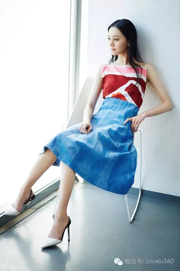 红色的吊带,搭配蓝色半身裙,清纯的小爽,也开始走性感路线了,搭配好、白色三角尖头高跟鞋,女人味十足。