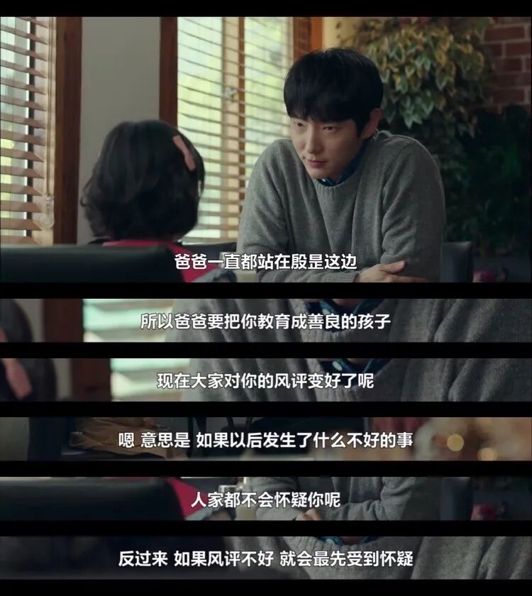随着剧情展开,原本以为是个“白切黑”的男主,其实是个“黑切白”。从小背负着杀人犯儿子的骂名长大,周边人都戴着“杀人犯的儿子也是杀人犯”的有色眼镜肆无忌惮地给他扣罪名——命案发生时,第一时间就想到他。