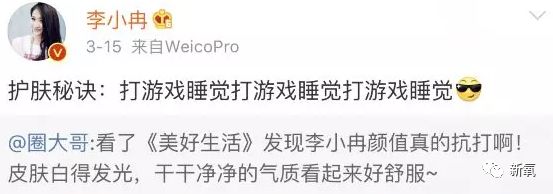 这不,好消息来了,前几天李小冉就在微博分享了自己的护肤秘诀:打游戏睡觉打游戏睡觉···