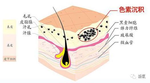 通过上面的图片就能看出来,黑色素的形状就像个长满爪子的小刺球,它会深入到皮肤组织的各个细胞里,使表皮的基底细胞层布满黑色素,从而导致皮肤变黑。