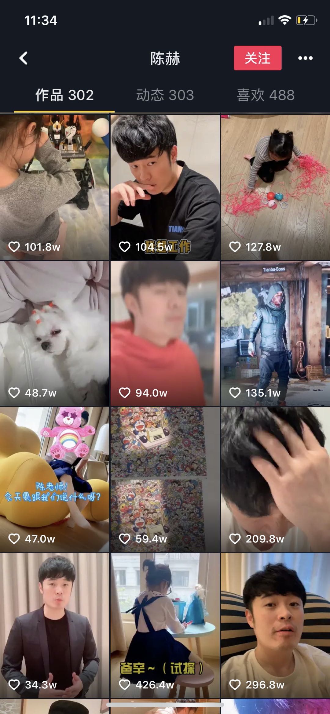 我粗略截图了一下,没想到陈赫一个窗口的12个短视频里,有5个是在耍帅的,有5个是在晒娃的,还有吃鸡短视频1个。