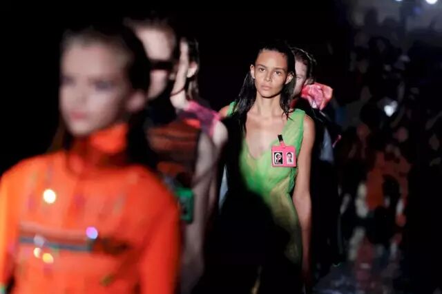 由此,Miuccia Prada再次采用了对其具有特别意义的尼龙面料,但此次的尼龙不再是只有黑,荧光色的尼龙面料令身材姣好的女性在黑夜里引人注目。