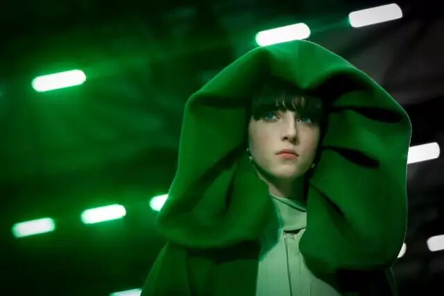 而惊喜来自于礼服的部分大大增加、针织衫及针织头套的出现则算意外惊喜,柔美的裙装搭配引人注目的头套,巨大廓形的外套将肃杀之气提升多个level。