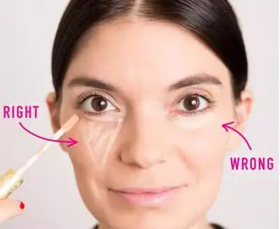 很多人都会以为,遮黑眼圈就是哪里颜色深遮哪里,但其实并不是这样哦。遮黑眼圈一定用遮瑕产品要在眼底到苹果肌的位置画一个三角,然后拍打开,而不仅仅是只画在黑眼圈处!三角画法不仅可以遮盖黑眼圈和眼袋,连脸颊也能一起被提亮而显得立体哟!