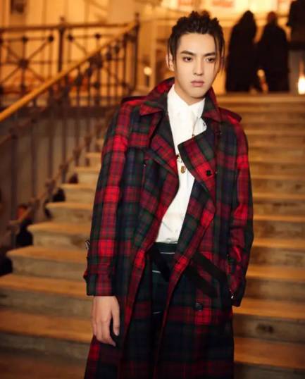 发布会上我们看到吴亦凡身穿的这件款格纹风衣,就是上面提到过的经典“红+绿”的对比格纹,他的下身同样也走苏格兰格纹路线,羊毛九分长裤与白衬衫,一改发布会前的风格,整体看上去更加成熟稳重大方,英伦范十足。