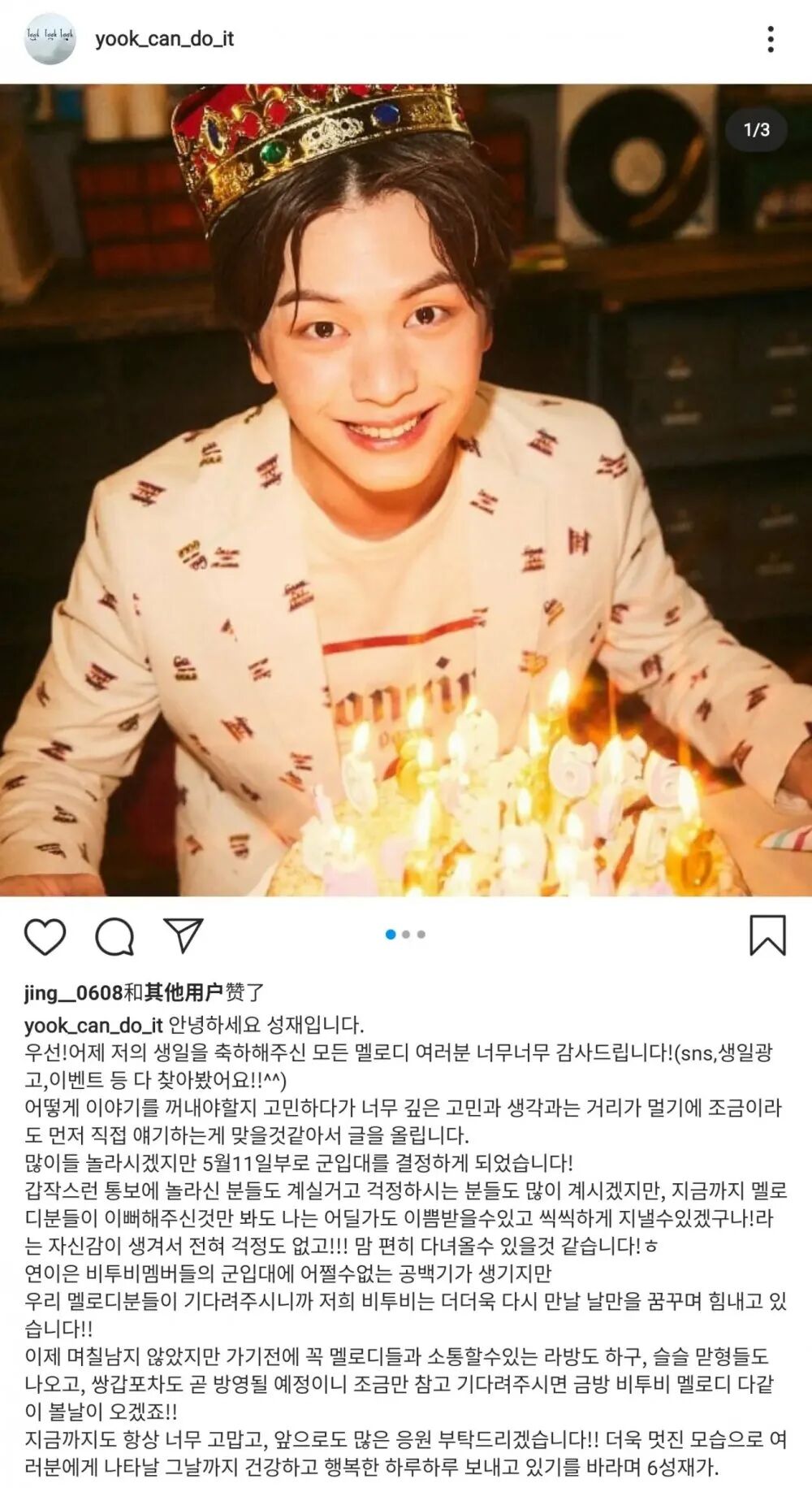 不过韩国的兵役制度就是这样的,只要你提交了入伍申请,随时有可能接到通知,当然,粉丝们也不要遗憾,毕竟SOLO都已经发了,就算是好好告别过了,只是短暂的分开而已,两年其实很快的。