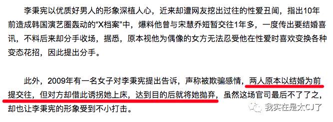 新闻还顺带提到了2009年,某普通女性向李秉宪提出告诉,说他以结婚为名将自己骗上床后又无端抛弃。也对李秉宪的形象造成了重创。