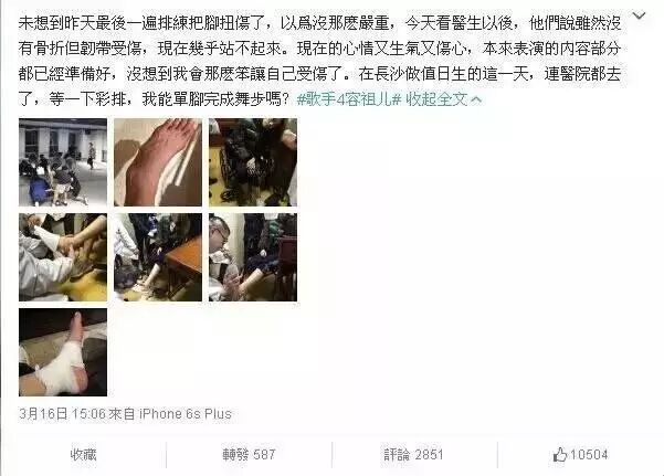 曾在微博中爆出自己在排练时不小心扭伤了脚
