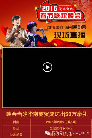 还烦着没有抢到票去看林子祥的演出?不用担心!在2月5日晚8时,只要您登陆“龙眼直播”微信公众号,就可以全程观看“茂名华南商贸城”2016茂名电视春节联欢晚会的手机现场直播,与现场同步观看林子祥、李文琦的演出,精彩节目,由你“掌握”!不用到现场也能看到最精彩的瞬间!