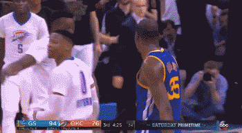 他知道在这里,无论说什么都无济于事,只有痛痛快快地赢球。后来威少下场,雷霆把最多26分的比分缩小到16分,威少再次上来后,杜兰特就有了下面这个超远三分,就贴着威少投进——