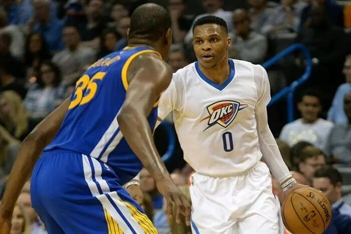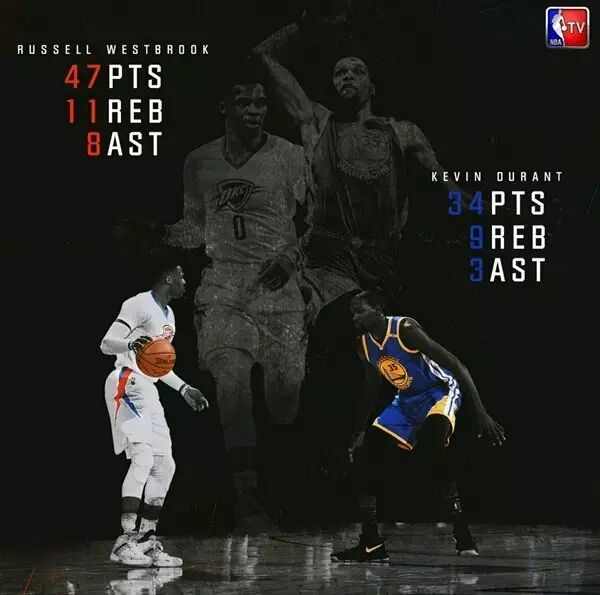 下半场开始,科尔把这一战当作全明星赛来打。他特地安排杜兰特去防威少,以配合现场的期待。杜兰特一共防了威少7个球,威少有5次投篮,进了两个。