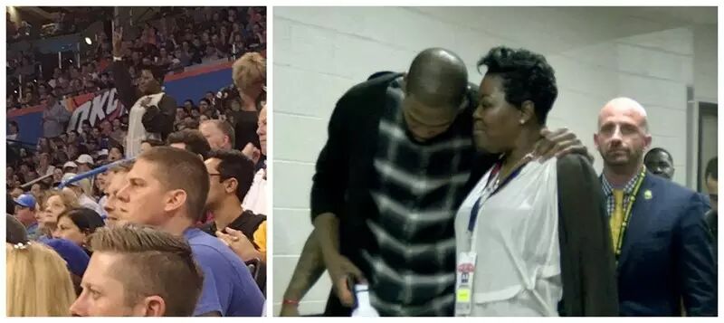 这里还有他熟悉的雷霆工作人员,其实并没有球迷那么high。你看杜兰特跟他们打招呼,这位大妈还很客气。其实,他在这里一直有着非常好的人缘。