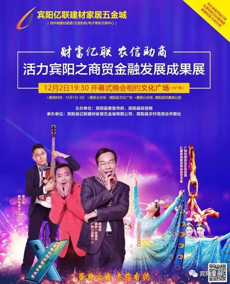 本次“财富亿联农信助商——活力宾阳之商贸金融发展成果展”由宾阳县经信局、宾阳县亿联建材家居五金城有限公司、宾阳县农村信用合作联社联合举办。12月1日-3日,商贸金融发展成果展主会场设在宾阳县文化广场,展览分会场设在宾阳县凤凰湖公园,展览活动将以图片、视频、实物、讲解、演绎等载体,展示改革开放40年、自治区成立60年来宾阳县经济社会发展的历程,展现宾阳人生活水平的发展提升。
