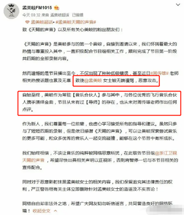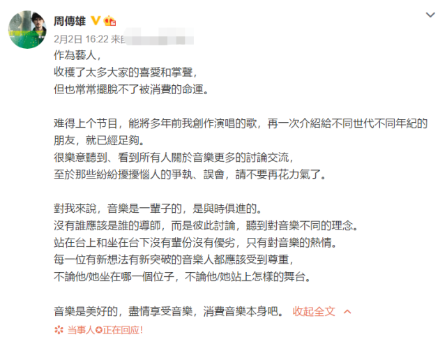 而在此之前,周传雄曾因为参加几档音乐类综艺,引发了很大的争执。不久前他现身《天赐的声音》演唱,广受好评,而当时孟美岐坐在台下,就引发了很多争议,认为周传雄当选手台上演唱,孟美岐却在台下当导师,很违和。此后孟美岐发声明否认了自己是导师身份,称只是音乐合伙人,选择的选手也是合作唱歌而已。周传雄对此也发文回应,称作为艺人摆脱不了被消费的命运,没有谁应该是谁的导师,希望大家不要花力气在无端的争执和误会上,希望大家能多关注音乐本身。
