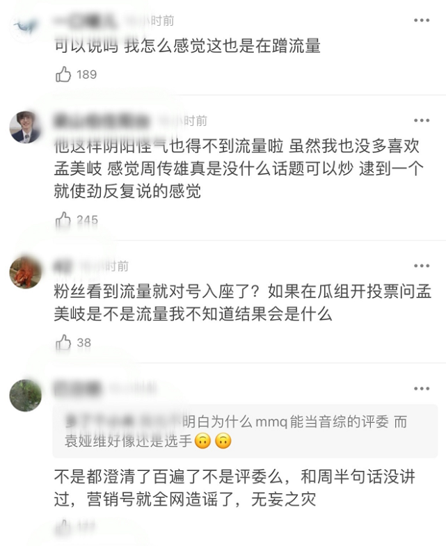 而在论坛上,周传雄因为这番话却被骂惨了。有网友吐槽周传雄曾经拉踩冯提莫,后来又如法炮制,拉踩孟美岐,自己对他一点好感都没有,同时还表示自己很好奇下一位受害者是谁。另一位网友则内涵周传雄接下来很可能有营销号和水军,也有网友吐槽他现在的采访就是在蹭流量,并且嘲讽他再阴阳怪气的内涵,也得不到流量的。
