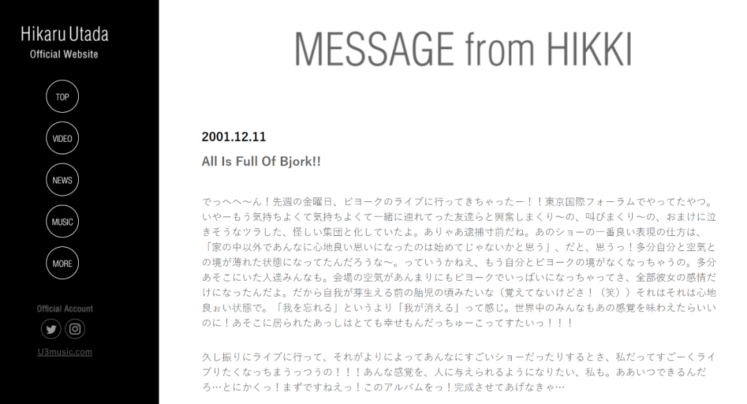 Bjork的嗓音能把任何和谐、宁静的旋律变得喜怒无常,歇斯底里。它似乎带着各种情绪,又似乎完全冷漠;既超现实,又完全自然。它让我想到神话里海妖塞壬的歌声。宇多田光是Bjork的忠实粉丝,2001年,17岁的光妹去看完Bjork演唱会后兴奋无比,在自己官网博客上说自己“跟偶像握手,幸福地发抖”,完全是小迷妹见大明星的感觉。