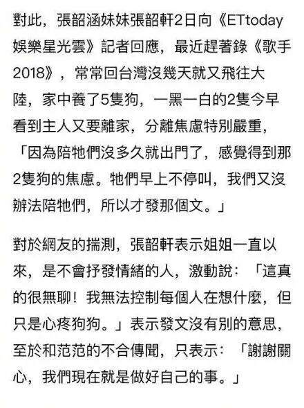 但是在昨晚,张韶涵的妹妹张韶轩回应了姐姐发文骂范玮琪夫妇的事情。