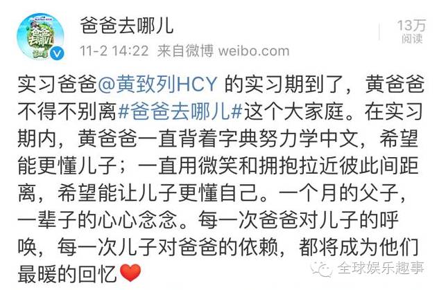 虽然只有短短一个月的实习期,但相信黄致列和李亦航父子俩的有爱互动一定萌化了很多人的心,也让更多的人认识到了执着音乐却又温暖善良的黄致列,其实有时候偏见只是因为陌生!而且对于一个来中国发展不足一年的国外明星来说,他捧起新华字典的那一刻就值得被尊重。