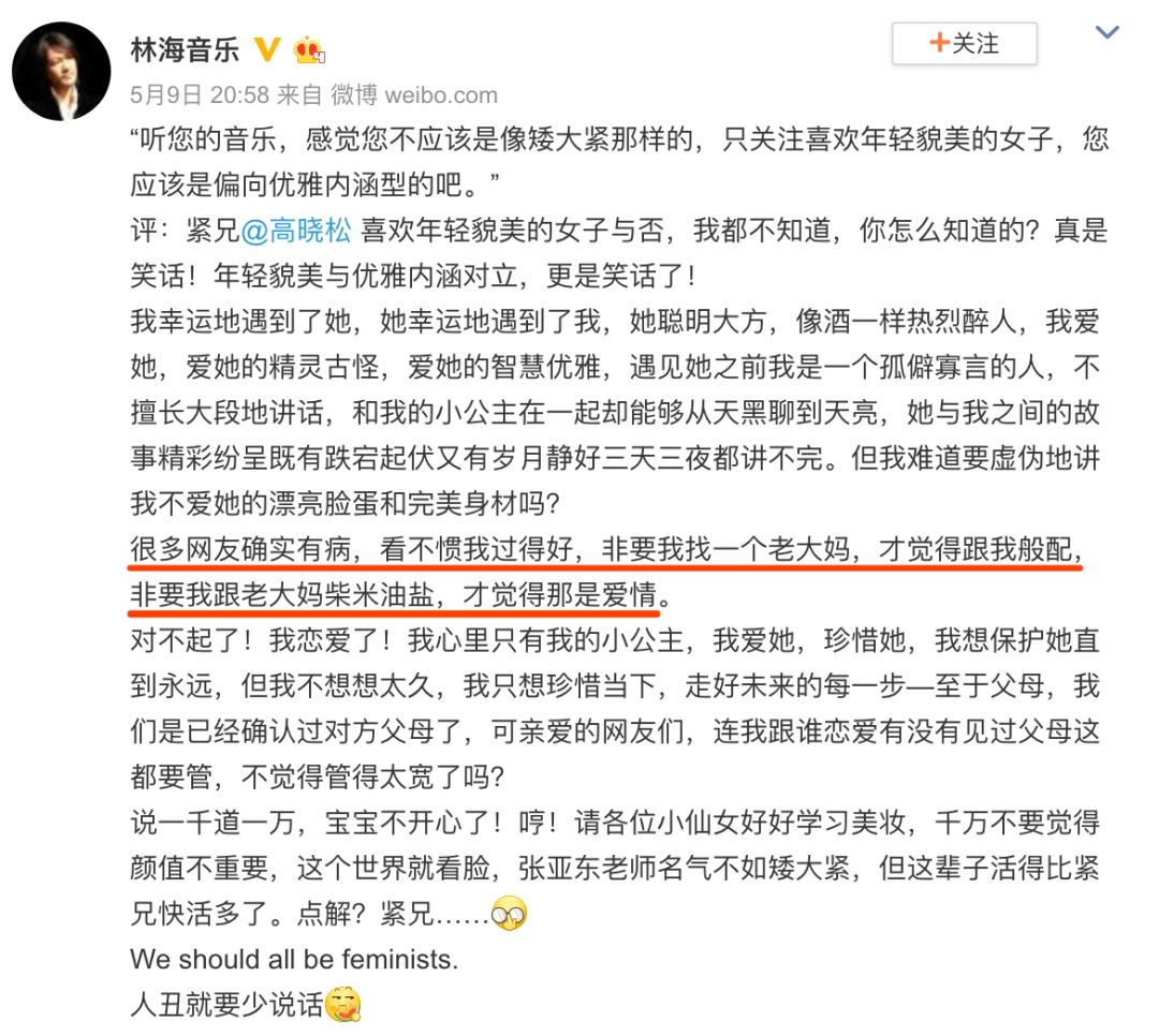 在这个崇尚爱情自由的年代,忘年恋并不鲜见,即使有争议,但那也是个人选择而已。可林海偏偏要用贬低年长女性,来抬高自己的品位。