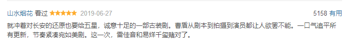 就冲着对长安的还原也要给五星,诚意十足的一部古装剧。曹盾从剧本到拍摄到演员都让人欲罢不能。一口气追平所有更新,节奏紧凑宛如美剧。这一次,雷佳音和易烊千玺赌对了。