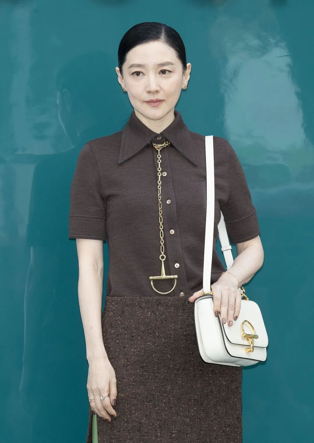 Bottega Veneta 的静奢老钱风,也很适合李英爱的气质。她曾多次受邀出席 Bottega Veneta 在韩国的品牌活动,棕色斗篷大衣配以大光明发型,优雅大气,静奢又老钱。