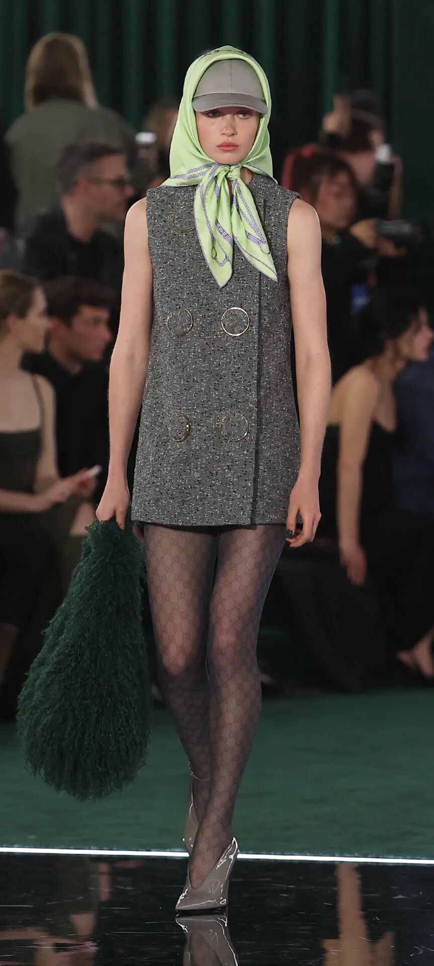 这套造型来自 GUCCI 2025 秋冬系列,李英爱把秀场模特的尖头高跟鞋换成了黑色筒靴,更适合秋冬季节。并且她还戴了一条白色项链,像给领口镶了一圈串珠,增加了灵动感。