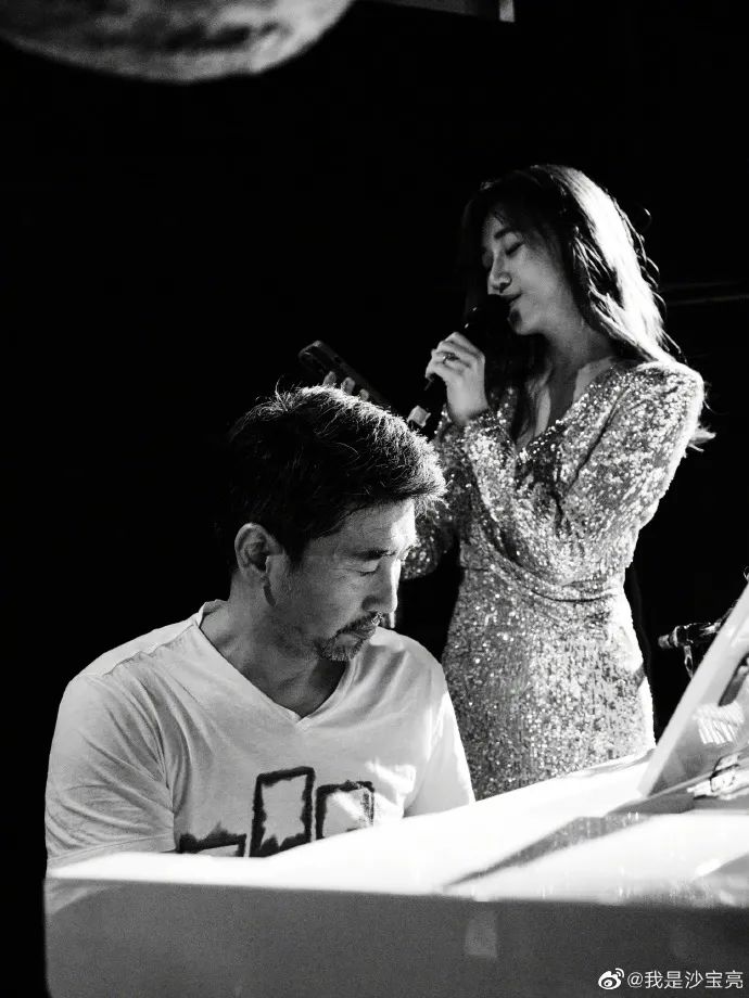 照片中沙宝亮弹着吉他,而戴笑盈拿着话筒在一旁唱歌。