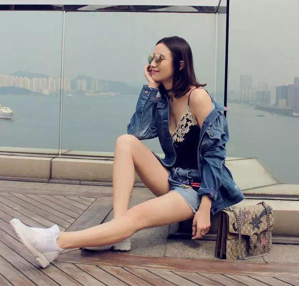 红色属于膨胀色,因此日常穿搭要特别注意,江同学这套look将红色皮裙换成了黑色短裤,令她看起来特别苗条,最后脚踩浅色系高跟鞋,令她的腿看起来又白又长,这些都是是亚洲女生穿衣必学的小诀窍呀。
