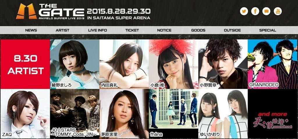 偶像大师 灰姑娘(アイドルマスター シンデレラガールズ)、i☆Ris、angela、川田麻美(川田まみ)、GARNiDELiA、SCREEN mode、Sphere(スフィア)、宫野真守(宮野真守)、Milky Holmes(ミルキィホームズ)、分岛花音(分島花音)、其他(排名不分先后,以日文50音顺序为标准)