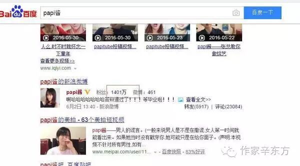 2016年开年以来,本文作者辛东方发现一个很有趣的现象:很多社区、朋友圈、视频社交网站等都在讨论“Papi酱”的事情。作为一个短视频主播,Papi酱以录制“搞笑”、“粗鲁”等视频,受到众多网友的关注,截止到在写这篇文章时,通过网络搜索发现,Papi酱的微博粉丝已达1401万。
