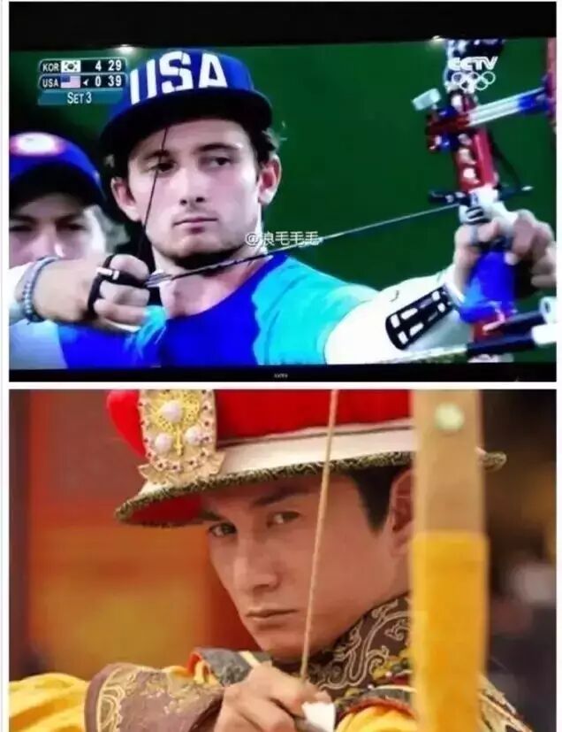 美国射击运动员扎基·加勒特撞脸吴奇隆,俩人做着一样的射箭动作,简直就是同一个人穿越在两个时空里的造型。