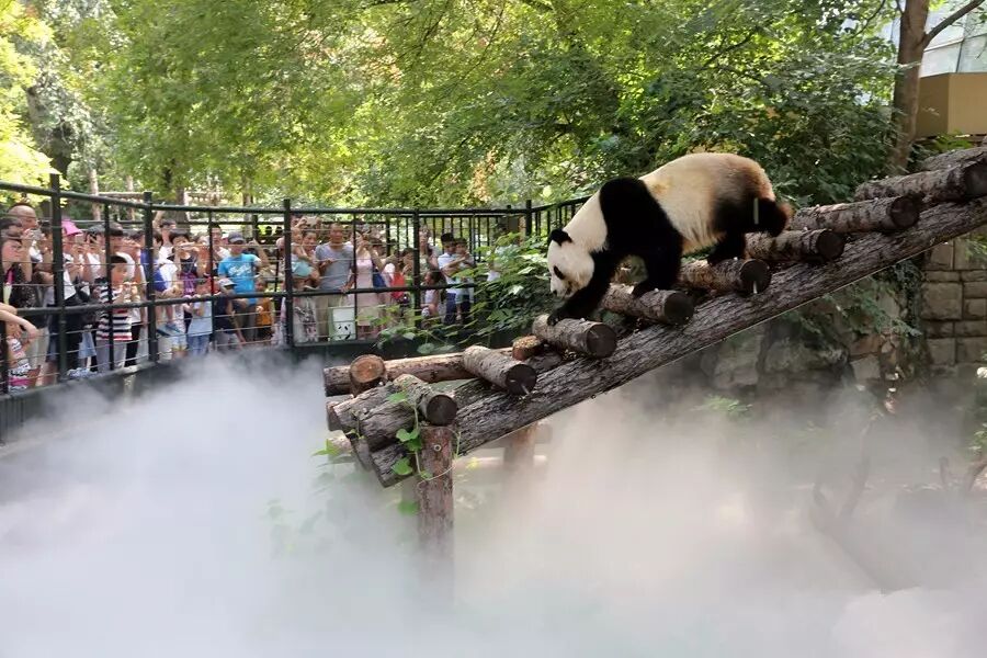 高温天气,北京动物园熊猫馆内开启喷雾设施,为熊猫送清凉。(新华网)