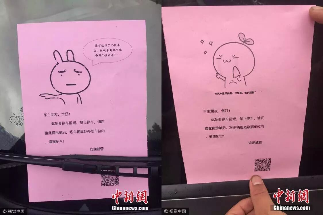 合肥滨湖城管部门别出心裁地设计了4类表情包提示单,并在两天内发放200份,警示市民规范停车文明出行。(中新网)
