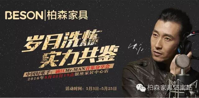 据悉,5月22日,由柏森家具和银座家居、济南电台Music88.7、济南电视台联合举办的柏森家具—岁月洗练 实力共鉴 暨满江 Mr.Man音乐分享会在济南市银座家居中心店举行。《中国好歌曲》男神满江将亲临现场,给消费者带来了前所未有的置家体验。