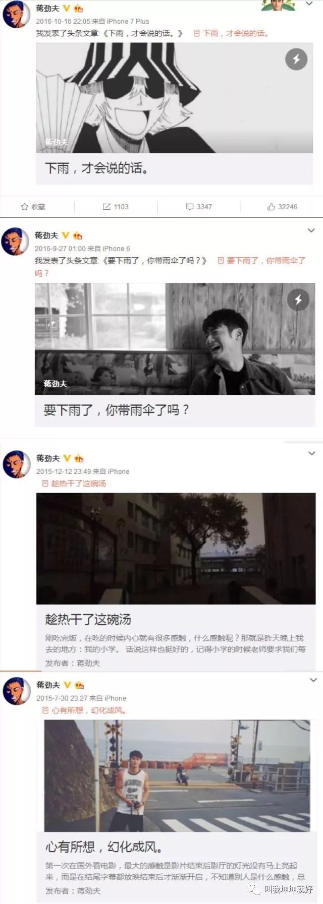 蒋劲夫属于团队不给力,自己也不着急的演员。没事打打篮球跑跑步,在日本拍拍照片吃吃饭(ins上很多自己拍的照片),没事写写文章感恩社会。