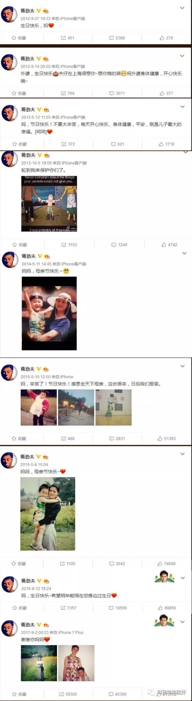 每年的母亲节、自己的生日、母亲的生日,都会发微博表示感谢和祝愿。