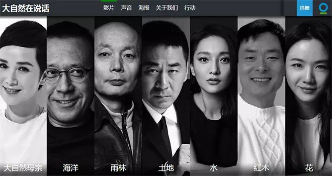 去年保护国际基金会推出了由蒋雯丽、姜文、葛优、陈建斌、周迅、濮存昕、汤唯,分别“演绎”大自然中的不同“物”语,受到了大家的一致好评。