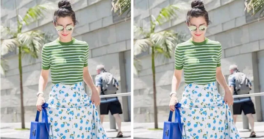 除此以外,她的其她穿搭也是非常惊艳的,图里她生生一生绿白色的条纹针织半袖衫,下搭一双白底的蓝色碎花裙,整个人看起来非常的有田园风格,非常具有生机感,有一种悠然见南山的感觉。