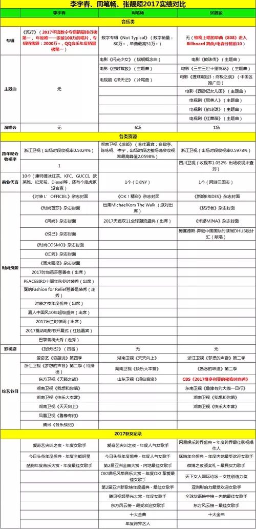 有看热闹不嫌事大的路人去做了一个三人17年的音乐成绩对比,比起李宇春和张靓颖的满满当当和大牌资源,周笔畅把各种踩边露脸的商业活动都算完了也还有一大片空白,恕我直言真是惨。