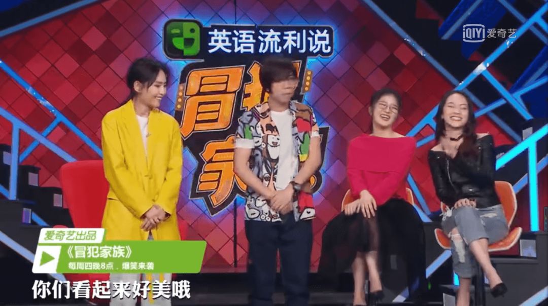 一进节目首先就耷着肩,双手缩在身前说:“你们都好美哦。”