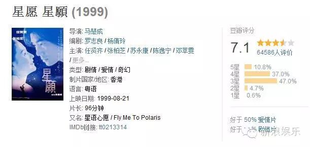 《星愿》至今在豆瓣的评分高达7.1分,在张柏芝主演爱情类电影中,除那部让她拿影后的《忘不了》以外分数最高的一部。