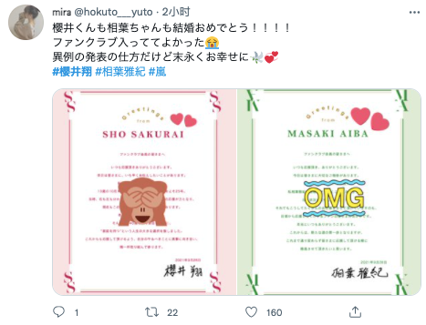 (译:祝贺樱井君以及相叶君结婚!我能进入他们的粉丝俱乐部真的是太好了,虽然是不合常规的公布格式,但是希望他们两个人永远幸福!)