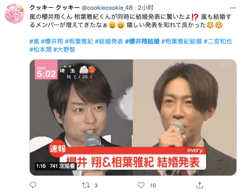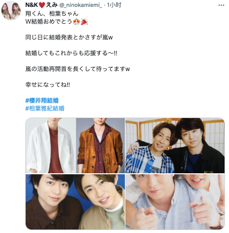 (译:ARASHI的樱井翔以及相叶雅纪同时公布结婚的消息,实在是太让我惊讶了!ARASHI结婚的成员又增加了呀。我能知道这个好消息实在是太好啦!)